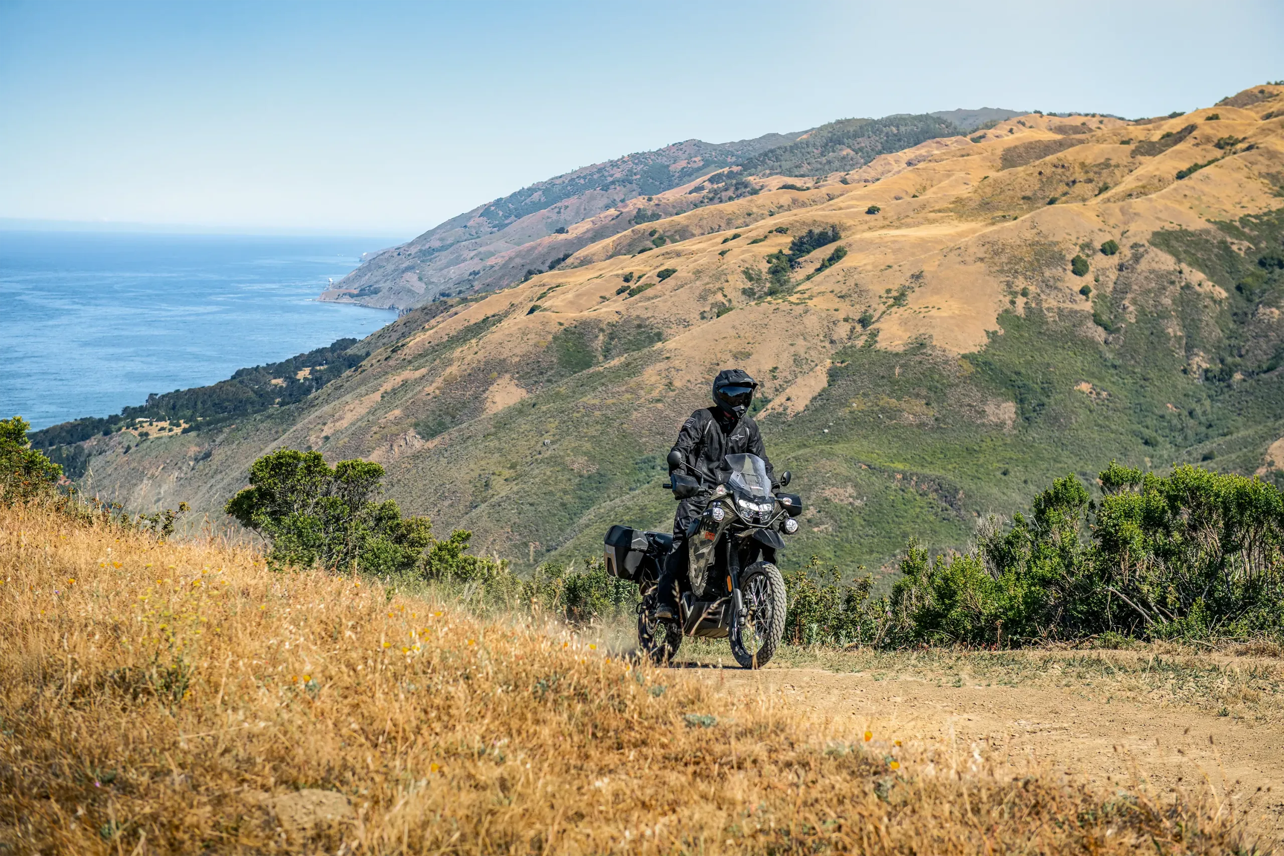 Long‑travel suspension, a 21‑inch front wheel, and a 17‑inch rear wheel balance bump absorption with steering stability on gravel, dirt, and broken pavement. Dual‑purpose tires provide predictable grip across changing surfaces, and the wide handlebar and upright ergonomics aid control at low speeds and over distance.
